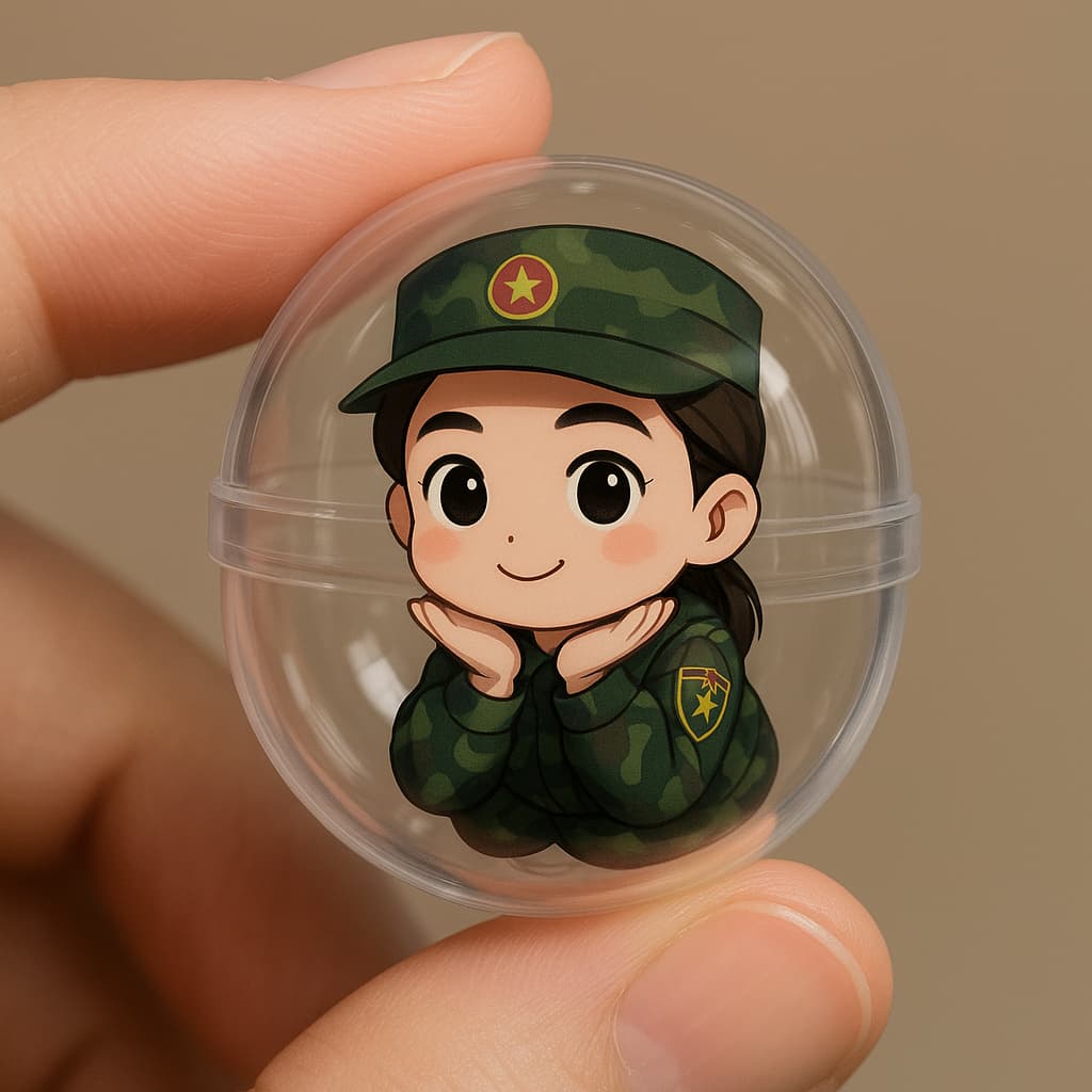 Hãy tạo ảnh chân dung của một viên nang gashapon chi tiết, toàn bộ bằng kính được giữ giữa hai ngón tay. Bên trong viên nang là phiên bản thu nhỏ của tôi với khuôn mặt của tôi, theo phong cách chibi dễ thương, kích thước thật, dựa trên hình ảnh đính kèm. Đảm bảo thiết kế nhấn mạnh tính xác thực của viên nang và sức hấp dẫn sưu tầm của chibi bên trong.