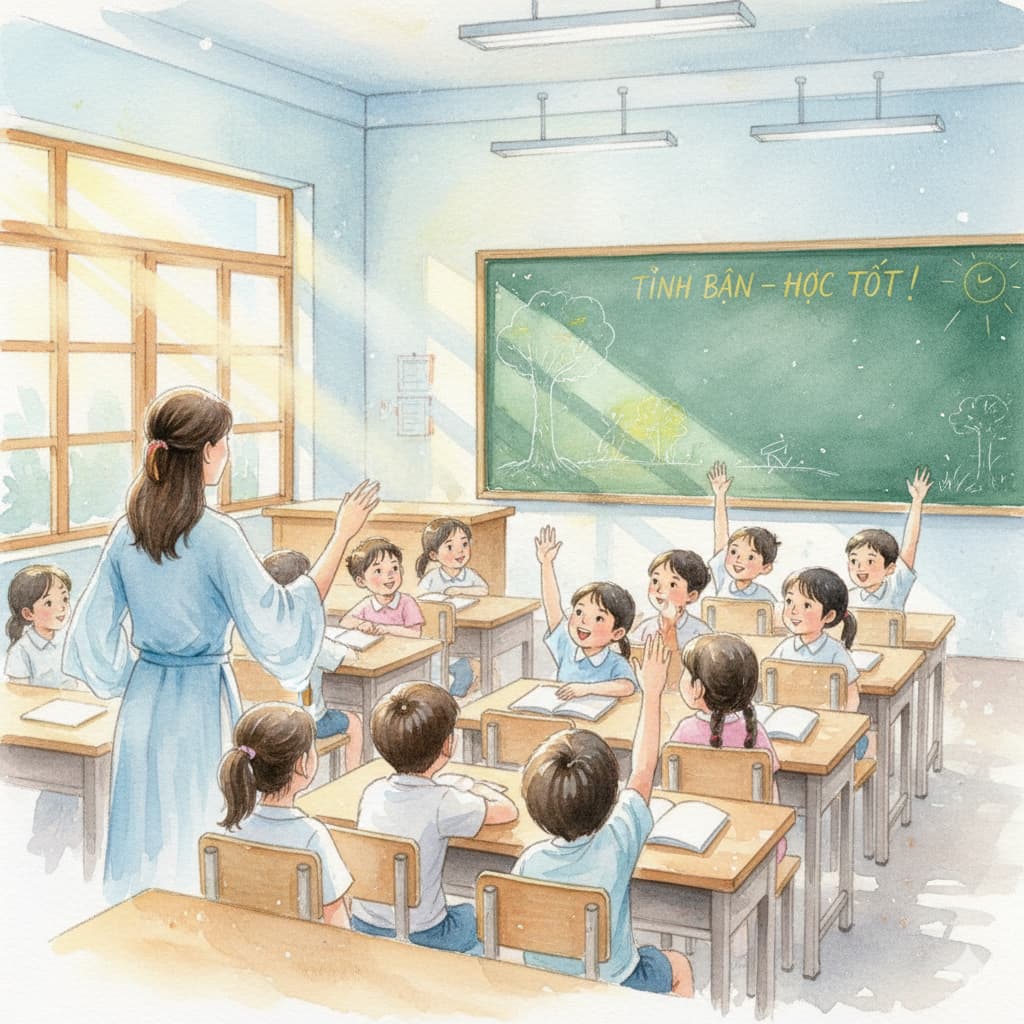 - Một số học sinh chăm chú lắng nghe, vài em giơ tay phát biểu, tạo không khí học tập sôi nổi.